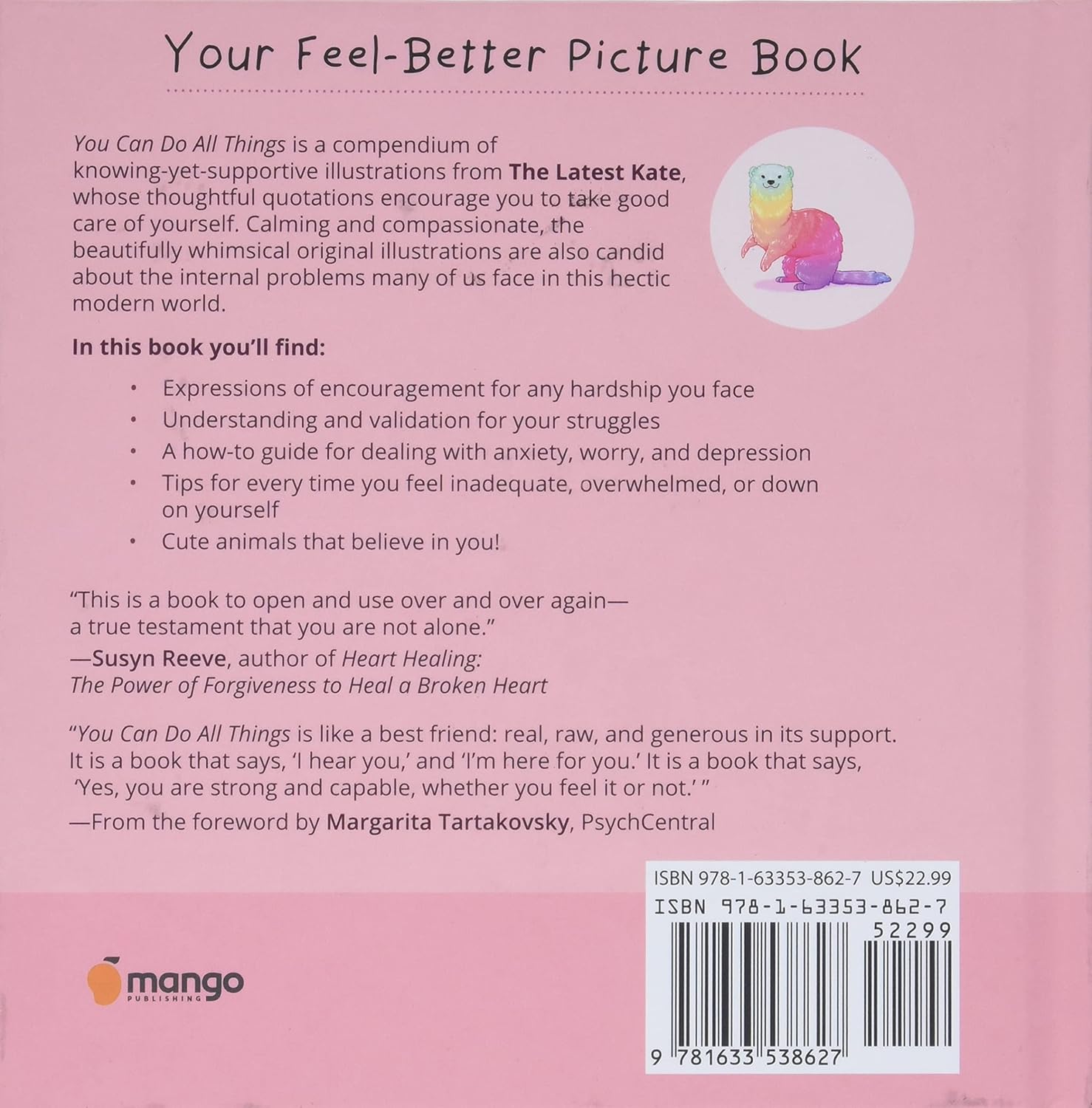 Inspirational, gentle drawings that sparkle with comfort. The Latest Kate's inventive pairing of whimsical colors and friendly, smiling cute animals is the spoonful of sugar that makes the heavy subject matter approachable and non-threatening. You Can Do All Things is a welcome addition to any bookshelf or art wall, and its messages are equally applicable to adults and children. Anxiety sucks, but you don’t! This book will show you how to get through the worst of it.